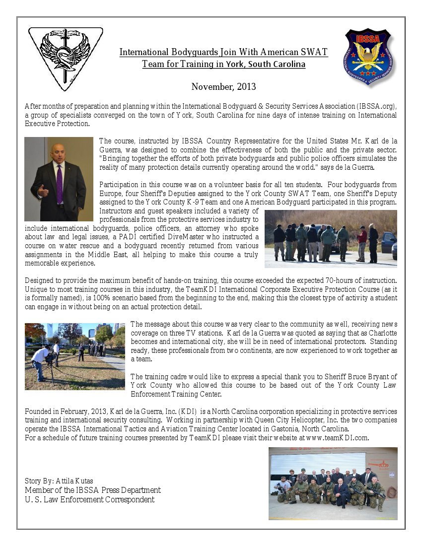 "After months of preparation and planning within the International Bodyguard & Security Services Association (IBSSA.org), a group of specialists converged on the town of York, South Carolina for nine days of intense training on International Executive Protection.