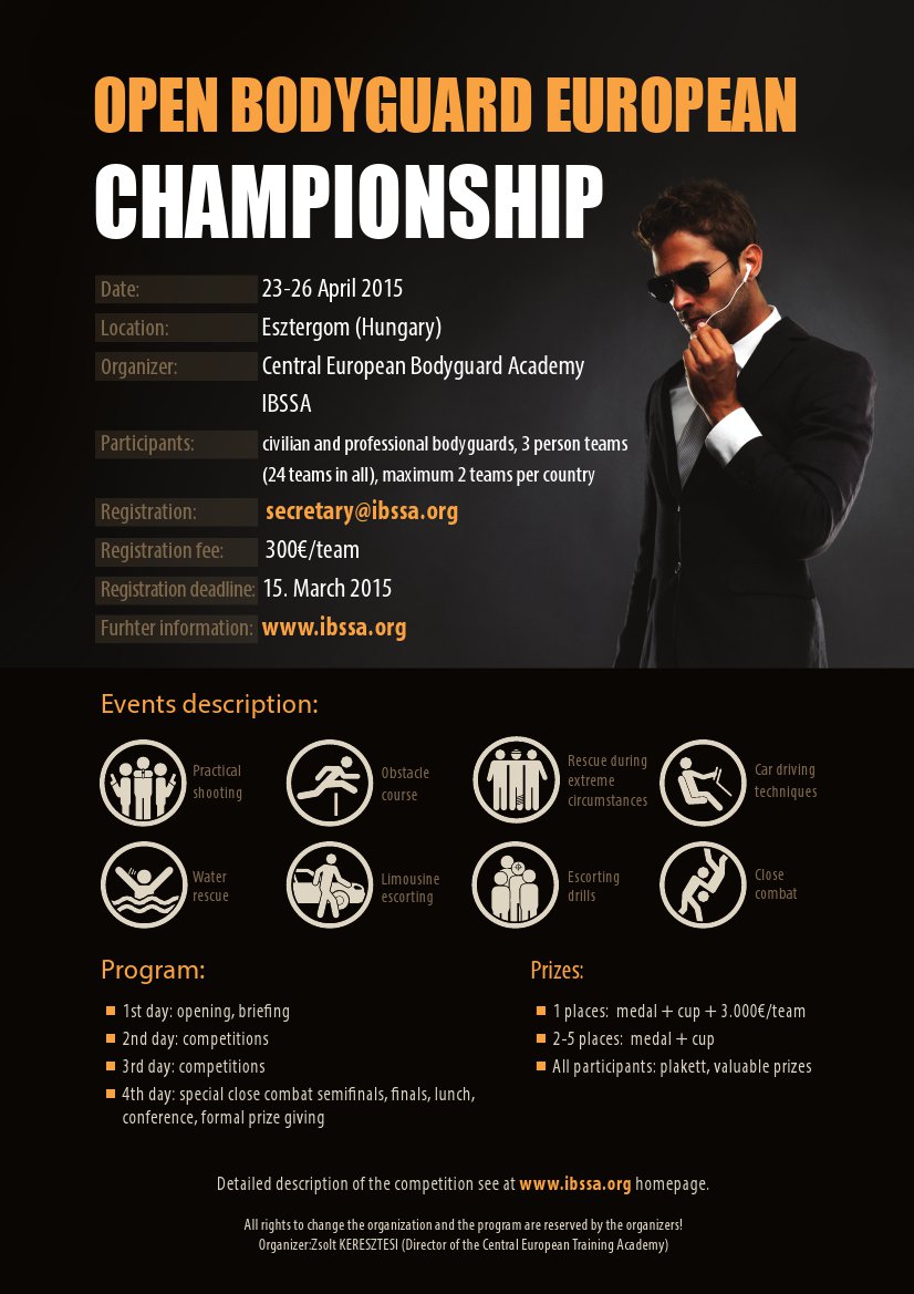 In September 2015 – in collaboration with CEBA as main organiser – the I. IBSSA Open Bodyguard European Championship will be held, where 3-person teams of professional and civil close protection experts and officers will have the opportunity to measure their knowledge in different situational tasks at several locations.