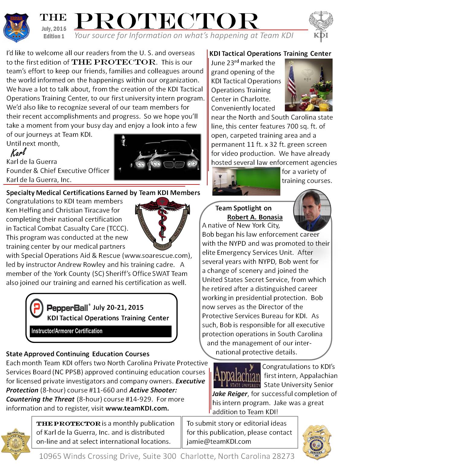 I’d like to welcome all our readers from the U. S. and overseas to the first edition of The Protector. This is our team’s effort to keep our friends, families and colleagues around the world informed on the happenings within our organization. We have a lot to talk about, from the creation of the KDI Tactical Operations Training Center, to our first university intern program. We’d also like to recognize several of our team members for their recent accomplishments and progress. So we hope you’ll take a moment from your busy day and enjoy a look into a few of our journeys at Team KDI.