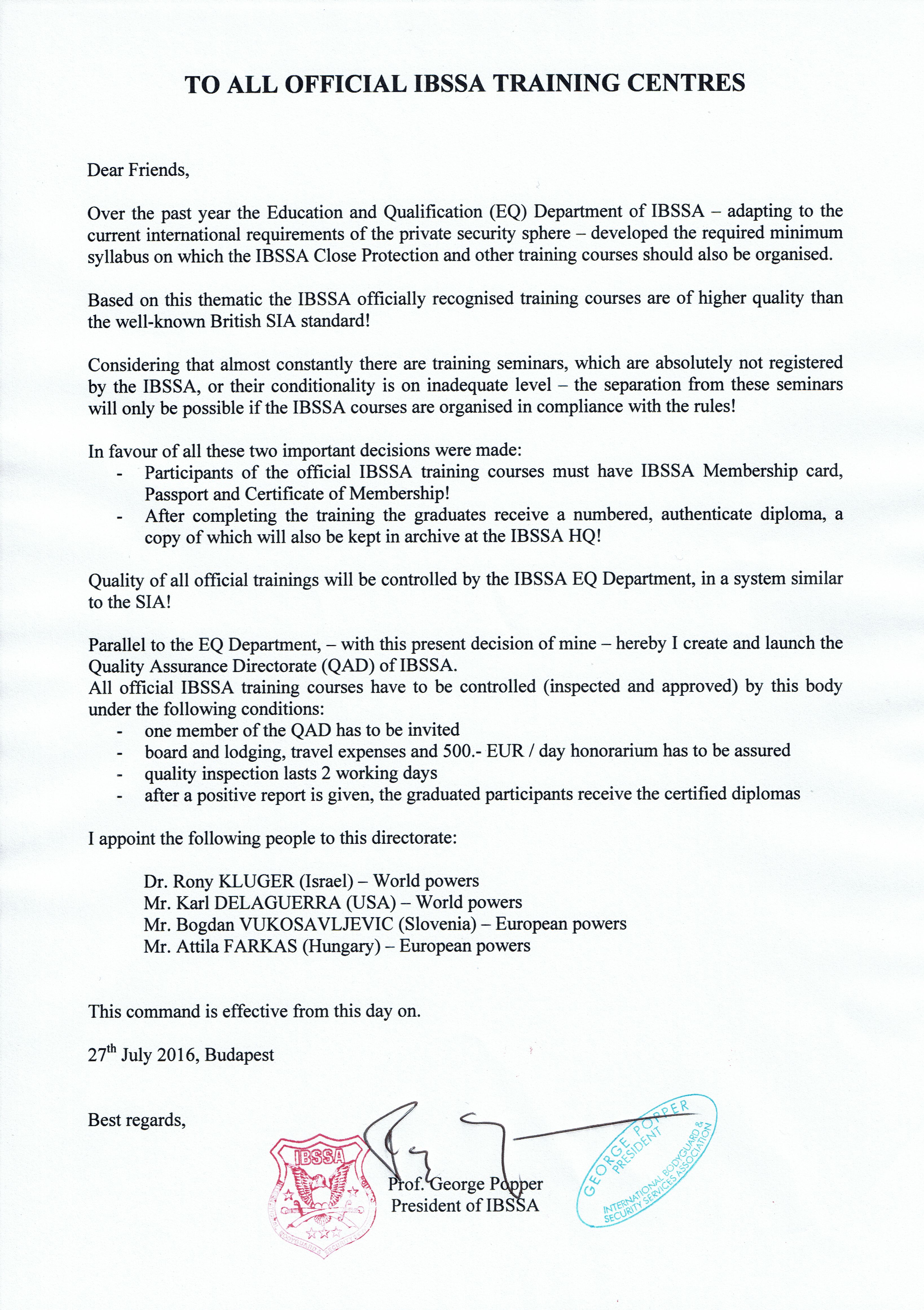 Over the past year the Education and Qualification (EQ) Department of IBSSA – adapting to the current international requirements of the private security sphere – developed the required minimum syllabus on which the IBSSA Close Protection and other training courses should also be organised.