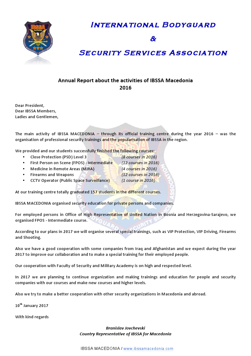 I invited and proposed two of the most prestigious bodyguard instructors in Mexico: Mr. Gonzalo Senosiain (specialized in fire arms) and Mr. Pablo Ortiz-Monasterio (specialized in security driving) to join IBSSA and qualify as official Instructors of the association. So last year we formed IBSSA Mexico executive committee, we have registered the official IBSSA training centre in Mexico, and all three of us have been qualified and accepted as IBSSA official instructors. ....