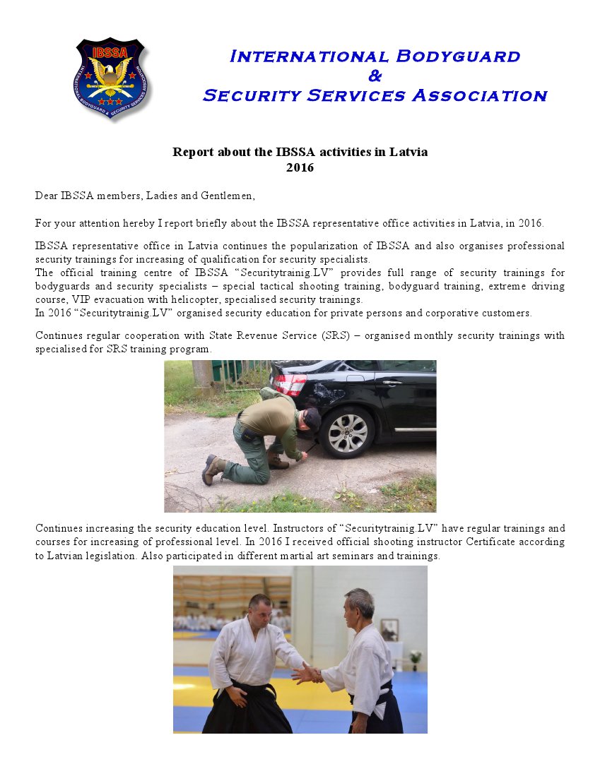 IBSSA representative office in Latvia continues the popularization of IBSSA and also organises professional security trainings for increasing of qualification for security specialists. The official training centre of IBSSA “Securitytrainig.LV” provides full range of security trainings for bodyguards and security specialists – special tactical shooting training, bodyguard training, extreme driving course, VIP evacuation with helicopter, specialised security trainings. In 2016 “Securitytrainig.LV” organised security education for private persons and corporative customers. ...