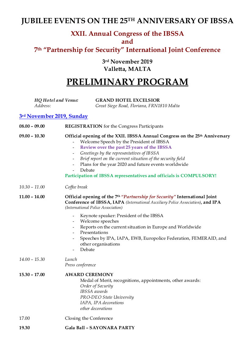 hereby we inform you that the XXII. Annual Congress of the IBSSA, and the 7th International "Partnership for Security" Joint Conference of IBSSA – IAPA – IPA with the official Award Ceremony - followed by a Gala Ball - will take place on the 3rd November 2019 (Sunday) at the Grand Hotel Excelsior in Valletta, Malta.