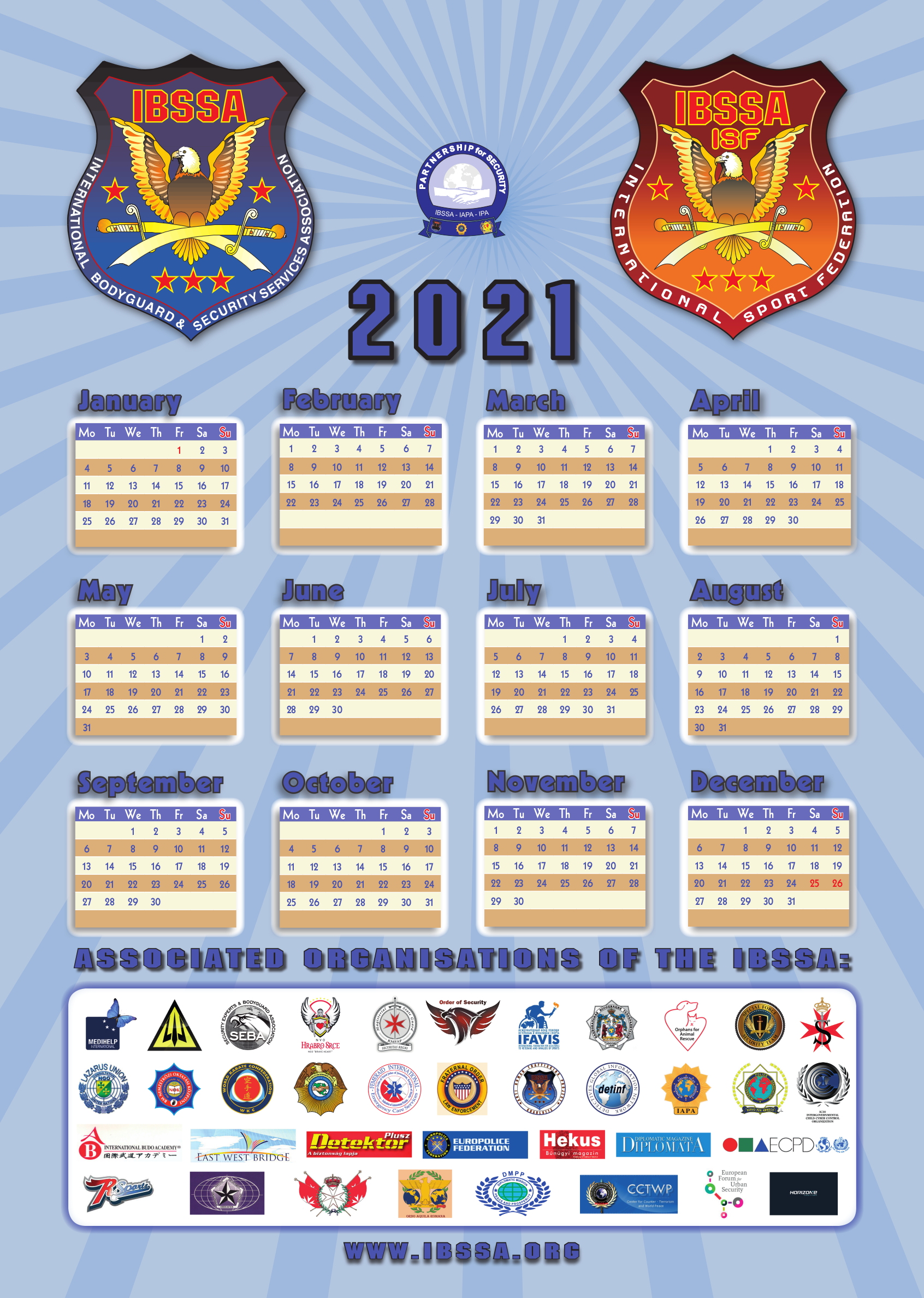 whereas the COVID-19 epidemic situation worldwide, the international travel regulations and/or the legislations about meetings and events did not allow us to meet many of our members in person, nor allowed our International Organising Committee to carry out the organization of the next Congress and Conference - which was scheduled to be held in September 2020 in Belgrade, Serbia - hereby we send you the IBSSA Calendar for the year 2021.