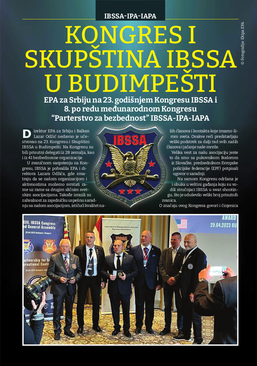 D irektor EPA za Srbiju i Balkan Lazar Odžić nedavno je učestvovao na 23. Kongresu i Skupštini IBSSA u Budimpešti. Na Kongresu su bili prisutni delegati iz 28 zemalja, kao i iz 41 bezbednosne organizacije.