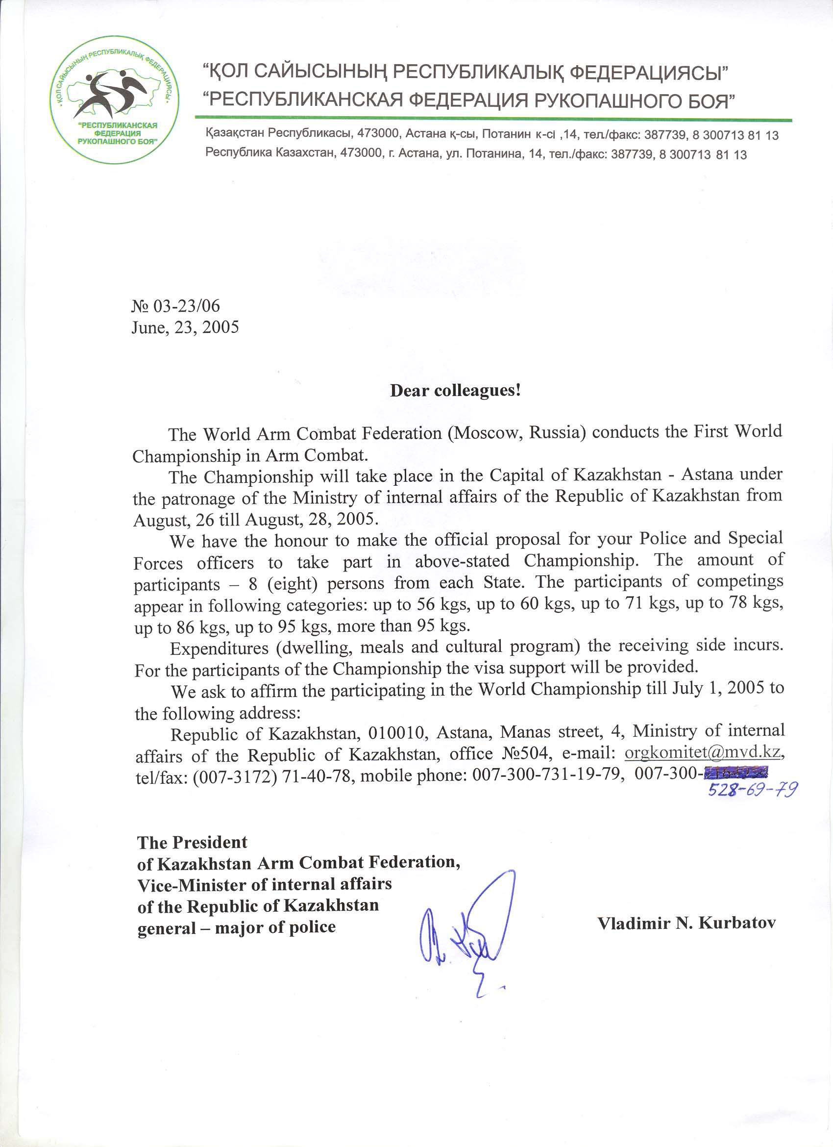 00312 - 2005.07.20. Information on the World Arm Combat Federation’s First World Championships between 26 – 28 August 2005 in Astana / KAZAKHSTAN