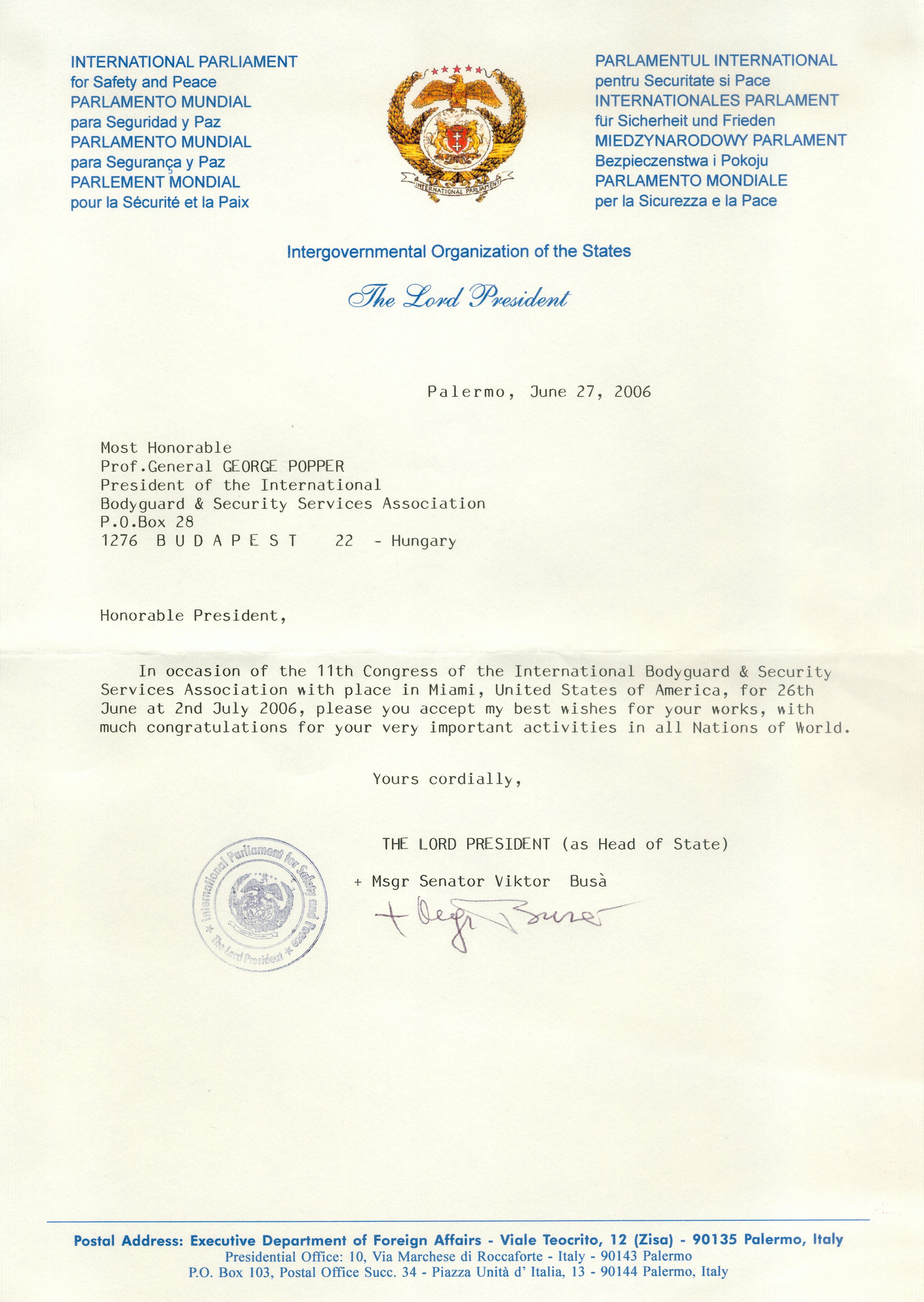 00365 - 11th Congress Greetings of Msgr. Senator Viktor BUSÁ – The Lord President of the International Parliament for Safety and Peace ANNEX 5